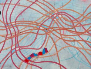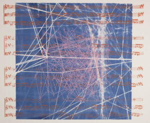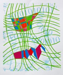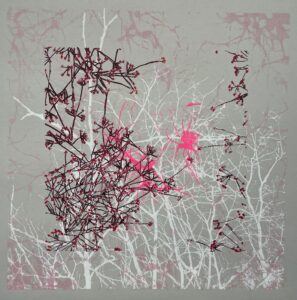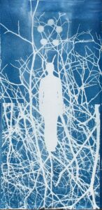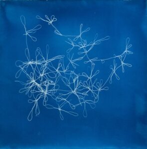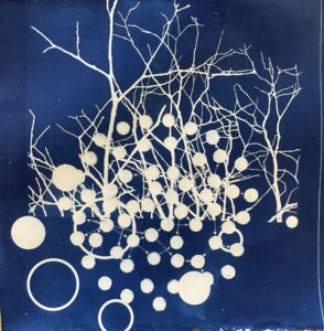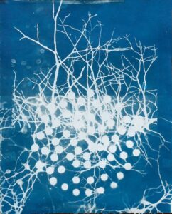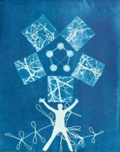 On Paper Juggling it All, 10 x 7 inches, cyanotype on paper Navigating the Web, 15 x 7.25 inches., cyanotype on paper Root-Connectors, cyanotype, 12 x 10 in. Super Spreaders, 12 x 10 inches, cyanotype on paper Delicate-Liaison, 12 x 12 in., cyanotype Tree-maps-I, 12 x 10 in., cyanotype – SOLD Root Causes, 15 x 15 in., silkscreen on stonehenge paper, run of 8 Energy-Fields, oil on Arches oil paper, 22 x 30 in. Thinking Off the Grid, 13 x 11 in., silkscreen print run of 8 Waves-and-Particles, oil on Arches oil paper, 22 x 30 in. Variations on a Theme V, 22 x 24 in., framed, silkscreen print open series EV Variations on a Theme IX</i , 22 x 24 in., framed, silkscreen print open series EV Whisper in My Head, 22 x 30 inches, oil on arches paper